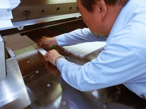 見本帳といってもいろいろな仕様を製本しますが、これは素材を小さく断裁する仕様です。 並べて、 先代のときからのコツを添えて、切る。 バラバラにならないように仕上げる。 立ててあるものが今回のタイプです。
