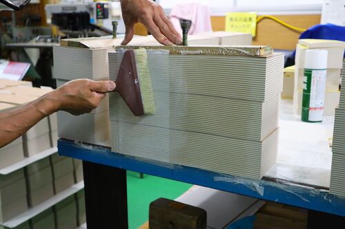 先日、天のり製本を行っていた時の風景。 まず、本の背側を断裁し、糊を塗って…… グラシン紙をぺたり。 さらにその上からもう一度糊を塗り、馴染ませていきます。 なぜ、このようなことをするのでしょうか? それは、強度の為です。 ただ糊を縫っただけの天…